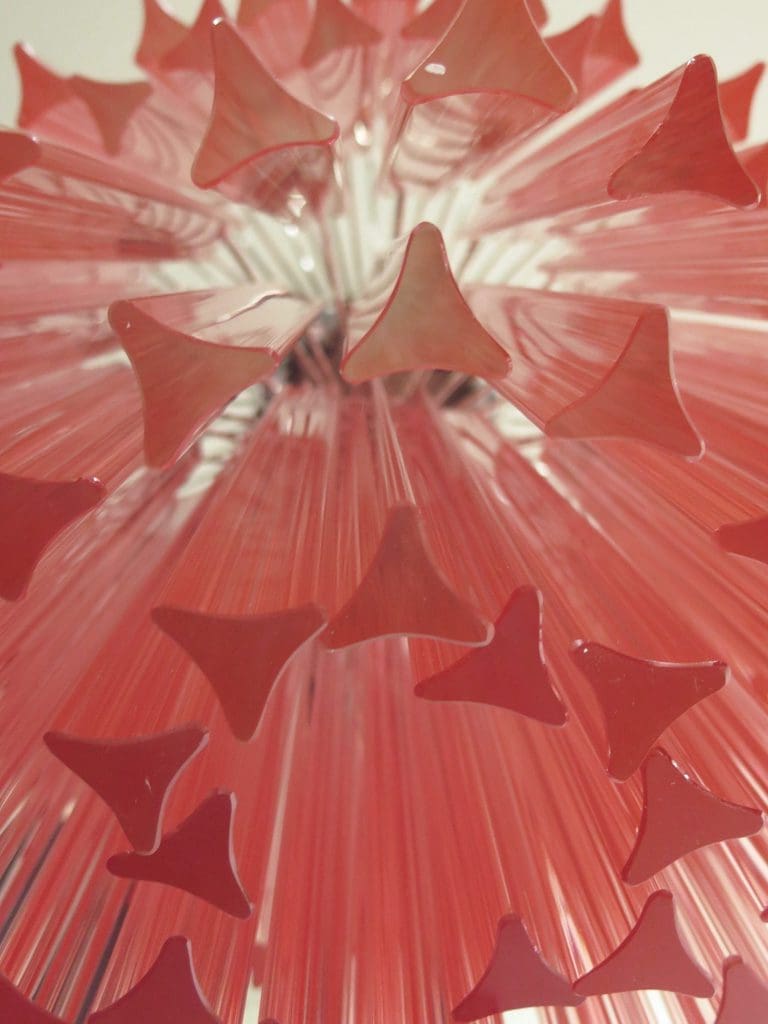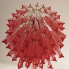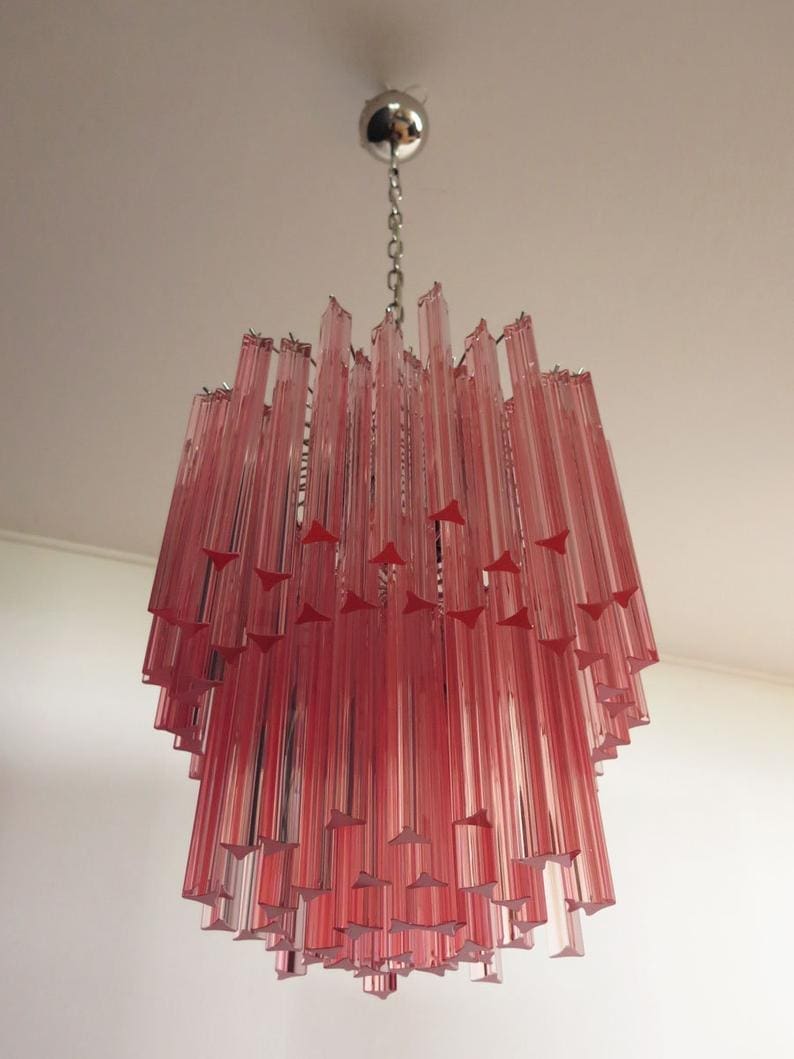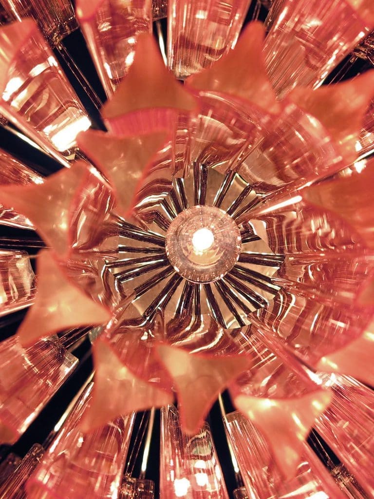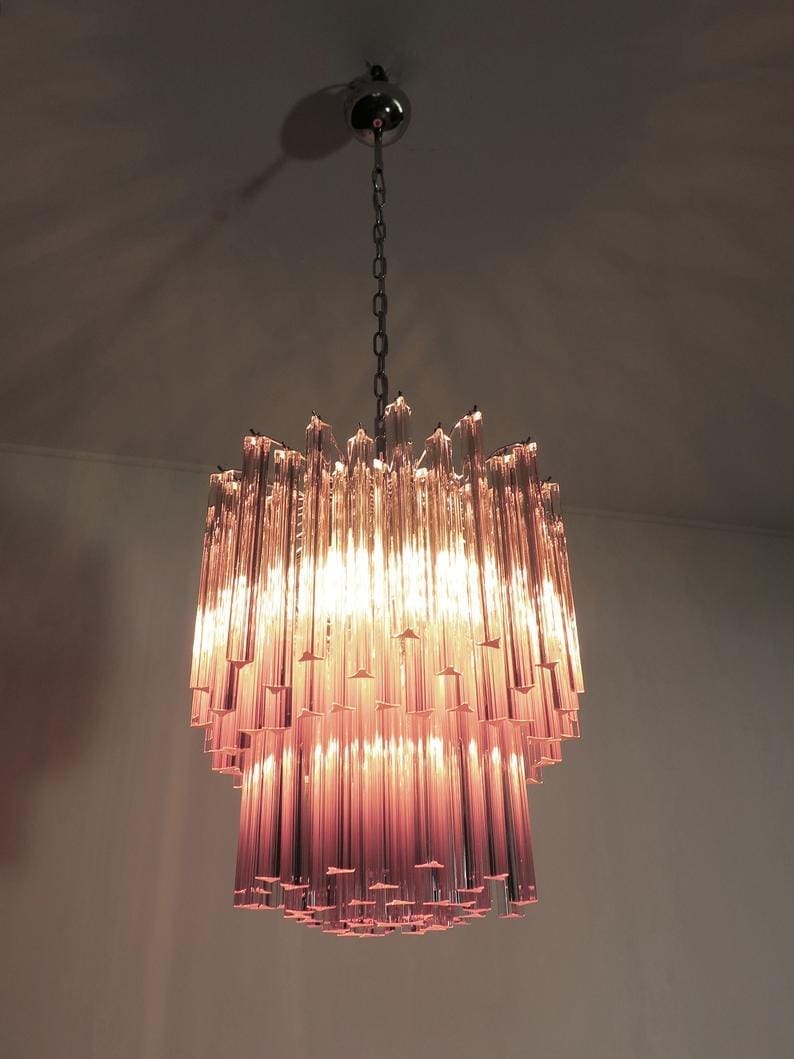 Opplev ekte italiensk håndverk med vår fantastiske Murano-lysekrone. Denne skjønnheten er håndlaget av 107 rosafargede Murano-prismer, hver enkelt elegant innrammet i metall.