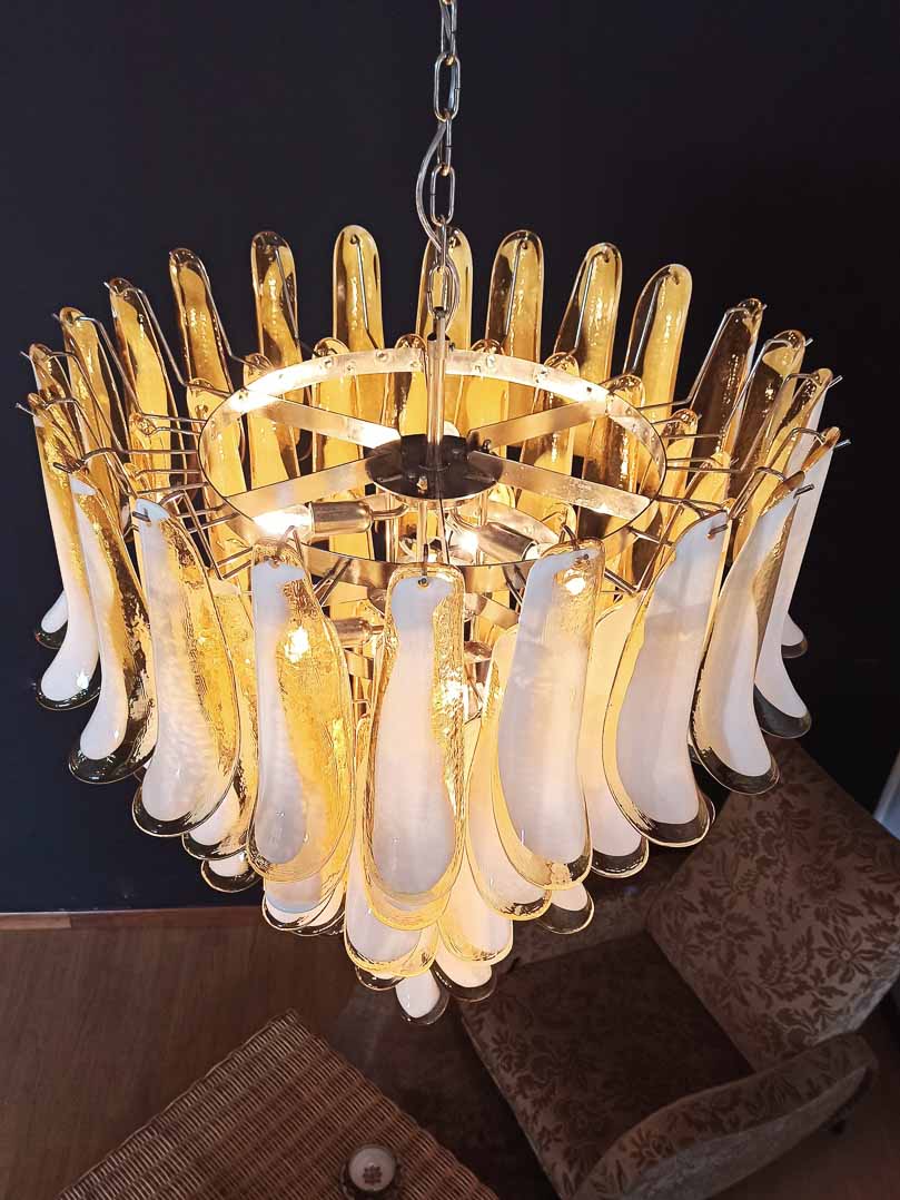 Skjem bort hjemmet ditt med en fantastisk skjønnhet med vår store og supervakre italienske Murano-lysekrone i Mazzega-stil. Denne fantastiske lysekronen er laget av 75 store karamellblader som er elegant innrammet i en kromramme.