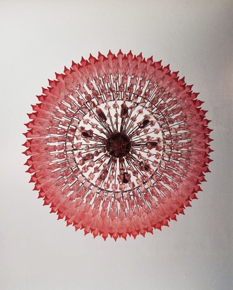 Bring eleganse og skjønnhet inn i hjemmet ditt med denne fantastiske Murano-lysekronen. Den er håndlaget med omhu og består av ikke mindre enn 391 rosefargede krystallprismer. Disse krystallprismene er nøye arrangert på en solid metallramme som skaper et vakkert visuelt inntrykk.