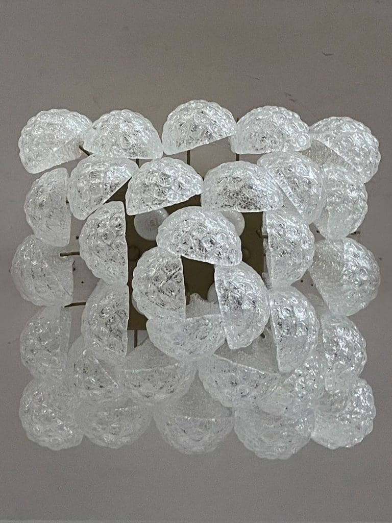 Skjem bort hjemmet ditt med en strålende italiensk Murano-taklampe som utstråler eleganse og finesse. Denne vakre lampen har 32 klare krystallglassblader som skaper et fortryllende spill av lys og refleksjoner i rommet. Hvert glassblad er nøye utformet med en glatt ytre overflate som er behandlet med krystallpulver og deretter ru på innsiden for å maksimere lysets skjønnhet.