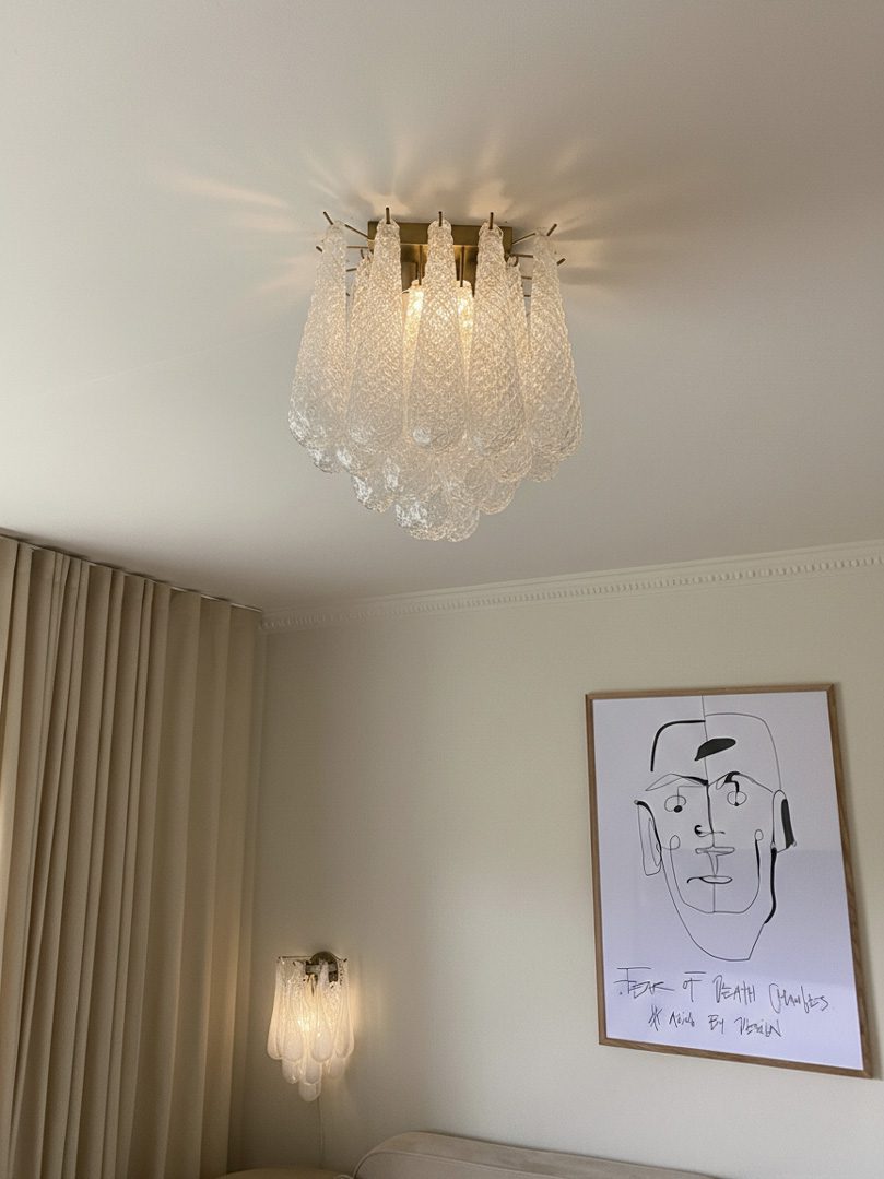 Denne Murano lysekronen er montert direkte i taket og leveres derfor uten kjede.